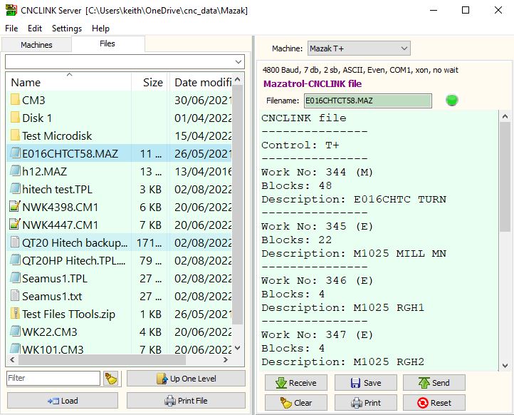 You can store Programs, machine setup files and Parameters using this option. Data is communicated and stored in hexadecimal so there is no print or edit option but we can display the work numbers and descriptions if they are entered on the Mazatrol CNC’s file management page. If you have our old software versions of CNCLINK or MAZLINK then your existing files are already 100% compatible with the latest CNCLINK version.